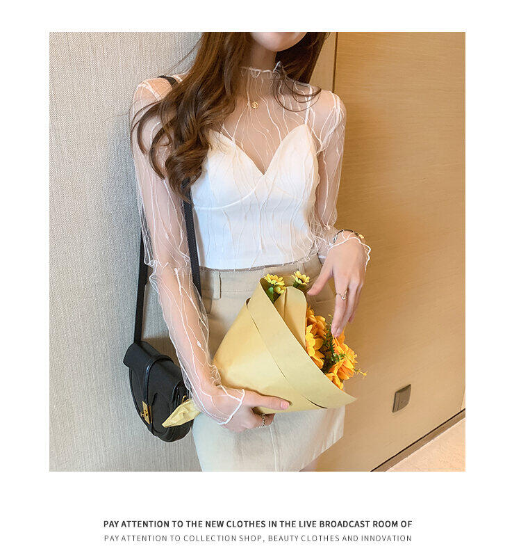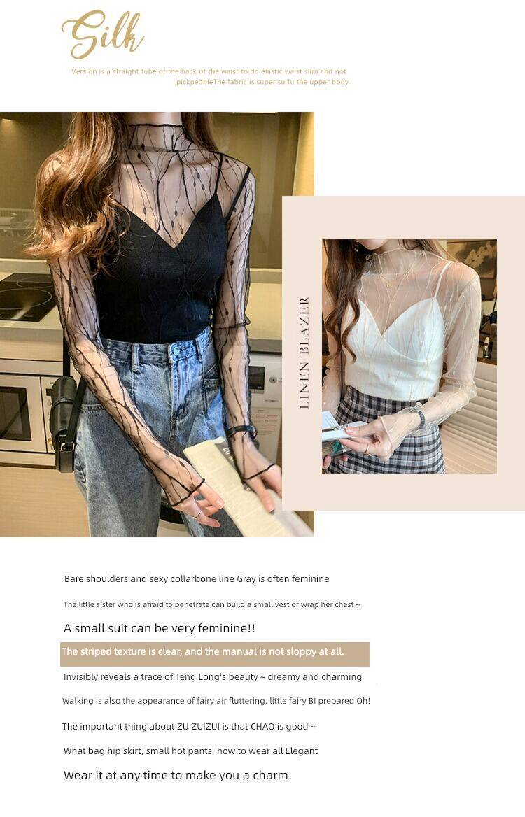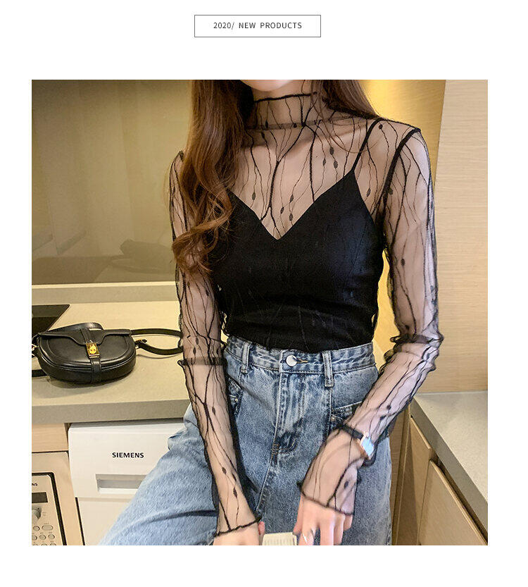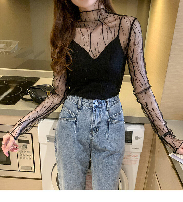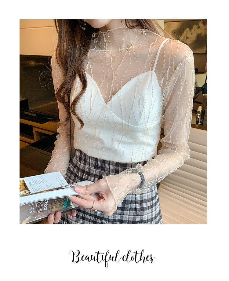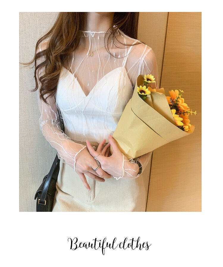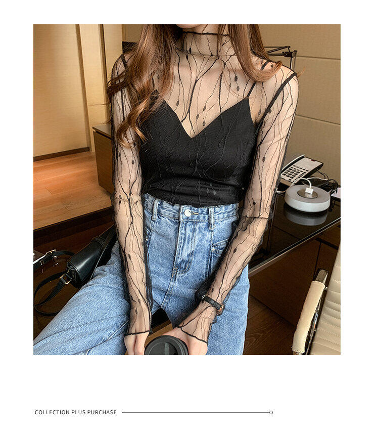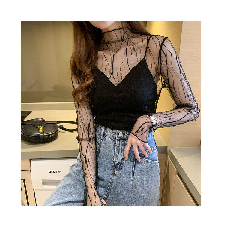 春秋简约长袖仙子透视蕾丝网眼