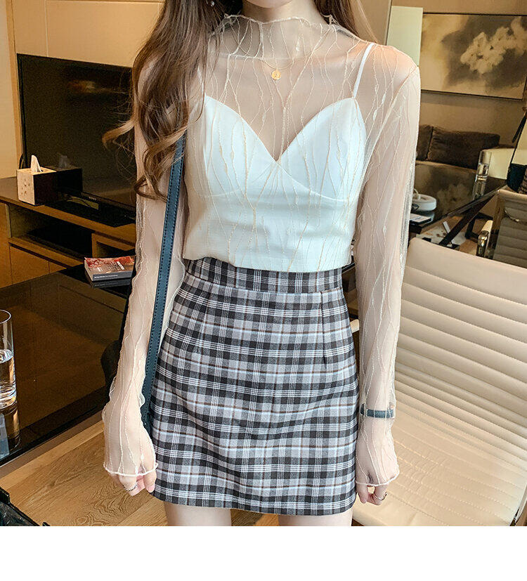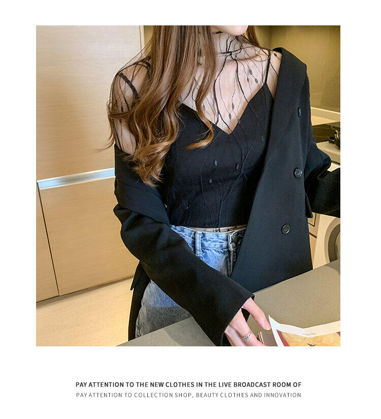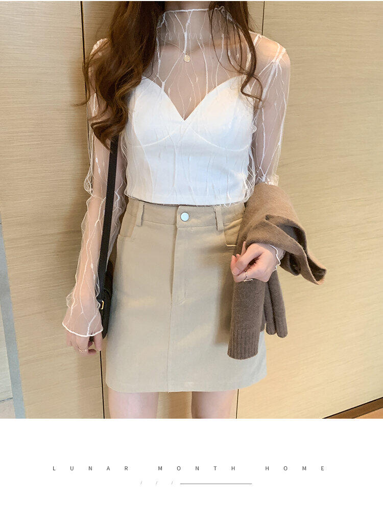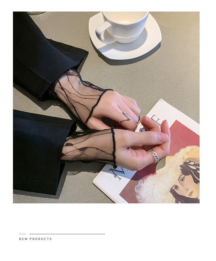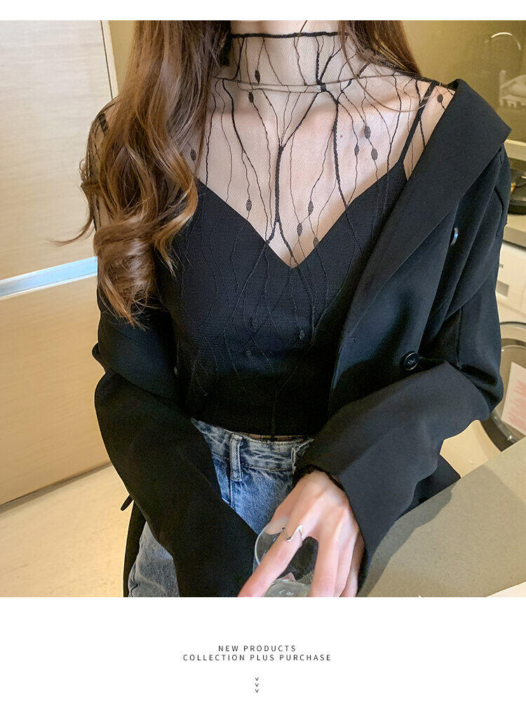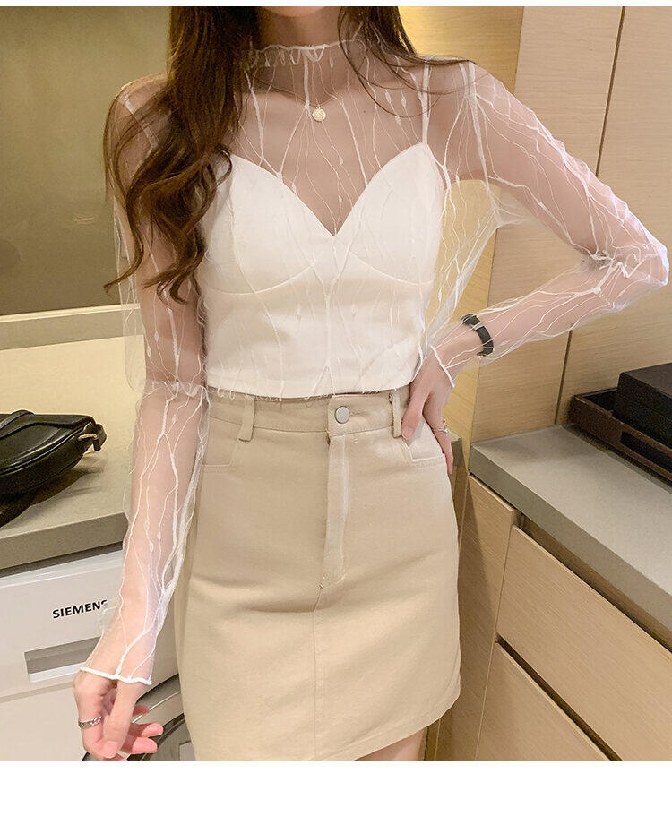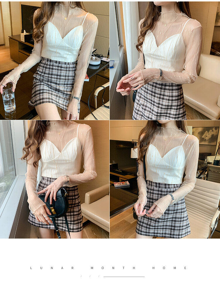 春秋简约长袖仙子透视蕾丝网眼